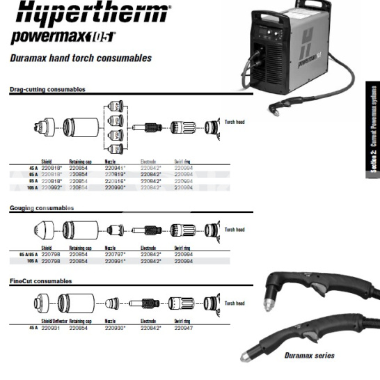 Применяется в металлообработке, авторемонте и строительстве. Аналоги: электроды Hypertherm 220842, но представленная модель выгоднее по цене при сопоставимом качестве. Преимущества: стабильная работа на максимальных токах, быстрая инициализация дуги, доступность (производство КНР, наличие на складе). Артикул: 220842.